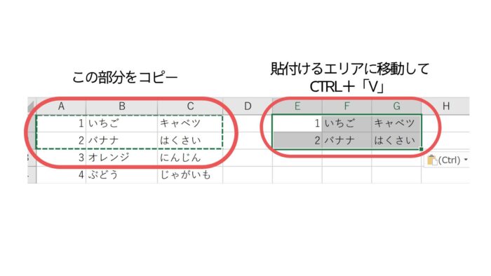 コピーしたエリアを横に貼り付けると↓同じ内容を貼り付けることができます。