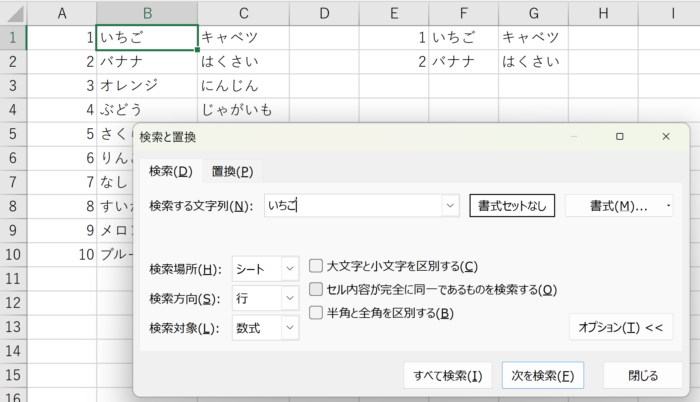「検索する文字列」部分に「いちご」と入力し、「次を検索」をクリックすると「いちご」が入力されているセルを探すことができます。