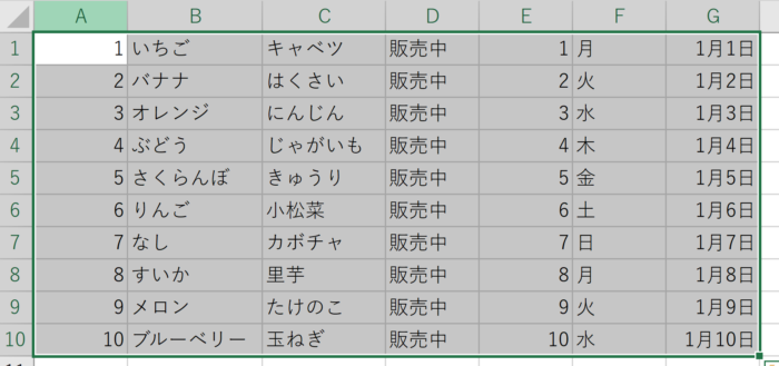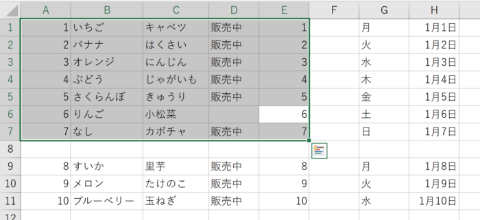 データが入力されているセルの範囲を選択する。データが繋がっている範囲を一度に選択することができます。