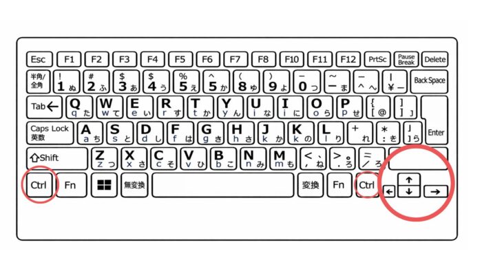 「Ctrl」ボタンは2個所にあることが多いです。ボタン配置はパソコンの機種毎に異なるので確認してみて下さい。「Ctrl」ボタンだけでは何も起きません。「Ctrl」ボタン以外の ボタンを一緒に押すことで動きが変わります。