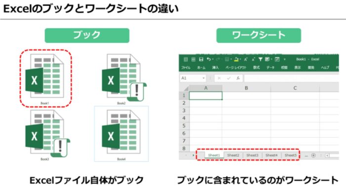 エクセルは「ファイル」単位で管理します。「ファイル」はいくつもの「ワークシート」で構成されています。「本」に置き換えてみるとイメージしやすいと思います。
