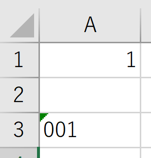 • 文字列 → 左寄せ(A3セルの「001」)