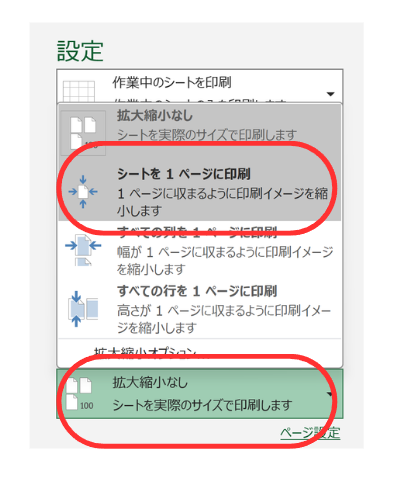 3.「設定」の中にある「拡大縮小なし」をクリックし、「シートを1ページに印刷」を選ぶ