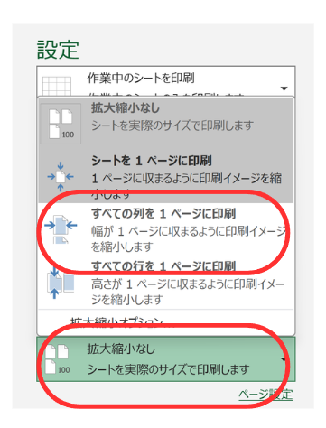 2.「拡大縮小なし」をクリック。「すべての列を1ページに印刷」を選ぶ