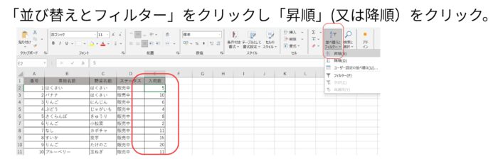 これだけで、Excelが表全体を自動で並び替えてくれます。(↓「入荷数」列を昇順で並び替え)